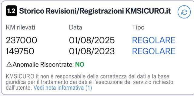 Revisione effettuata a km 237000 il 01/08/2025.